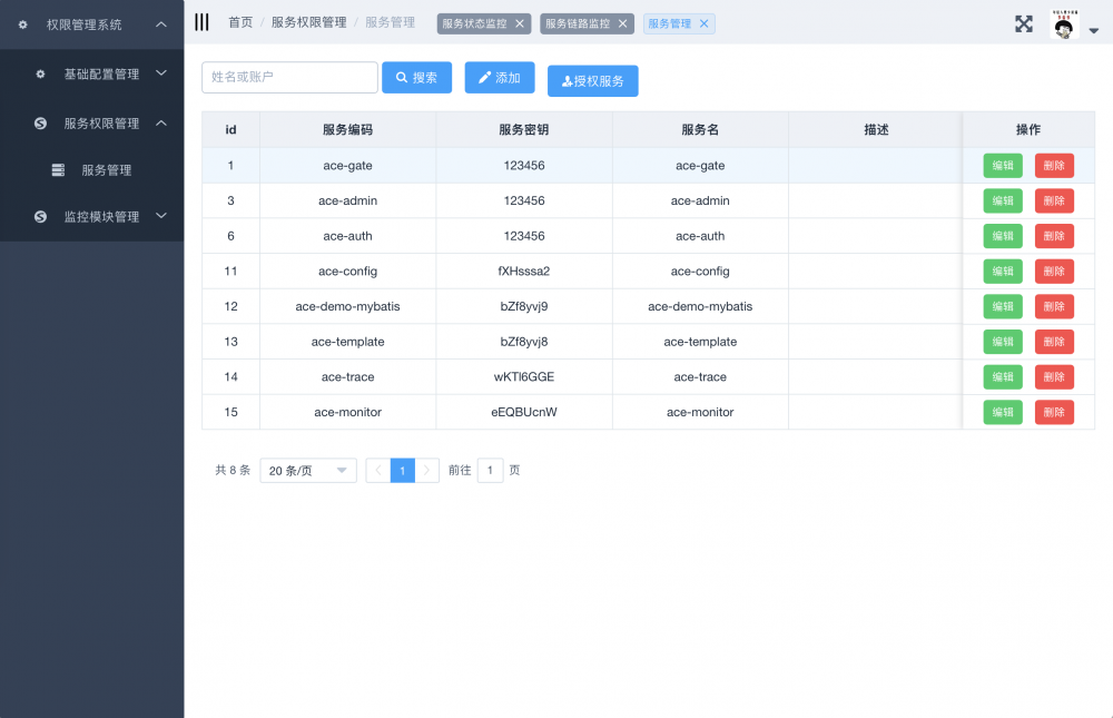 ├─ace-security │ │ │ ├─ace-modules--------------公共服务模块(基础系统、搜索、OSS) │ │ │ ├─ace-auth-----------------鉴权中心 │ │ │ ├─ace-gate-----------------网关负载中心 │ │ │ ├─ace-common---------------通用脚手架 │ │ │ ├─ace-center---------------服务注册中心 │ │ │ ├─ace-control--------------运维中心(监控、链路) │ │ │ └─ace-sidebar--------------调用第三方语言 │