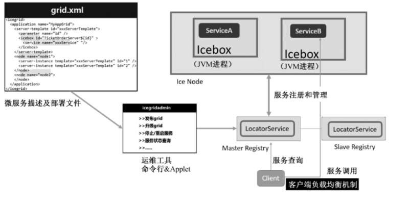 ZeroC IceGrid作为一种微服务架构,它基于RPC框架发展而来,具有良好的性能与分布式能力,如下所示是它的整体示意图。