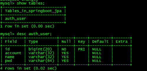 Hibernate: drop table if exists auth_user Hibernate: create table auth_user (id bigint not null, account varchar(32), name varchar(32), pwd varchar(64), primary key (id)) engine=InnoDB