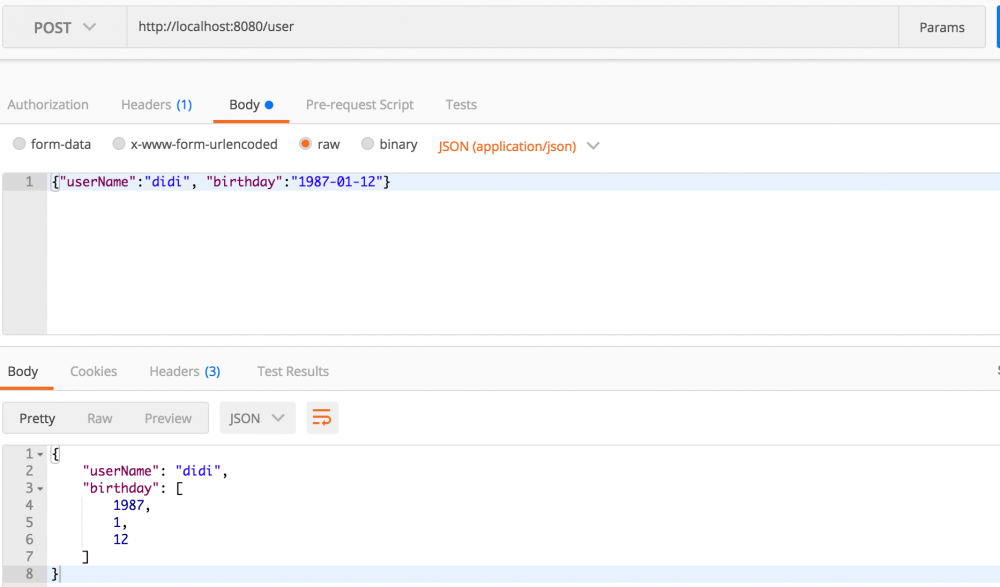 2018-03-13 09:22:58,445 WARN [http-nio-9988-exec-3] org.springframework.web.servlet.mvc.support.DefaultHandlerExceptionResolver - Failed to read HTTP message: org.springframework.http.converter.HttpMessageNotReadableException: JSON parse error: Can not construct instance of java.time.LocalDate: no suitable constructor found, can not deserialize from Object value (missing default constructor or creator, or perhaps need to add/enable type information?); nested exception is com.fasterxml.jackson.databind.JsonMappingException: Can not construct instance of java.time.LocalDate: no suitable constructor found, can not deserialize from Object value (missing default constructor or creator, or perhaps need to add/enable type information?) at [Source: java.io.PushbackInputStream@67064c65; line: 1, column: 63] (through reference chain: java.util.ArrayList[0]->com.didispace.UserDto["birthday"])