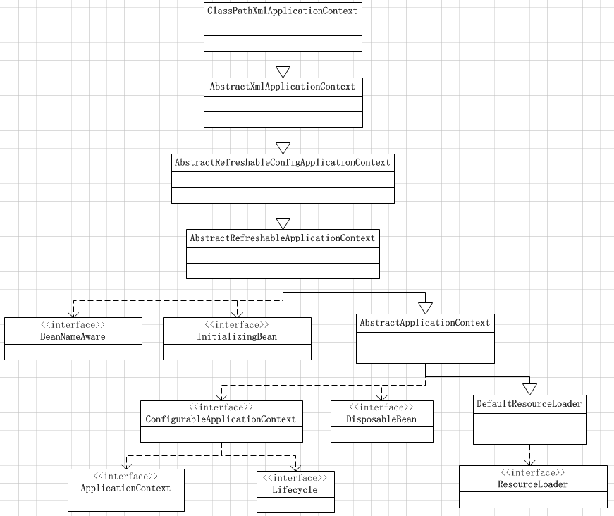 ClassPathXmlApplicationContext用于加载CLASSPATH下的Spring配置文件,可以看到,第二行就已经可以获取到Bean的实例了,那么必然第一行就已经完成了对所有Bean实例的加载,因此可以通过ClassPathXmlApplicationContext作为入口。为了后面便于代码阅读,先给出一下ClassPathXmlApplicationContext这个类的继承关系:
