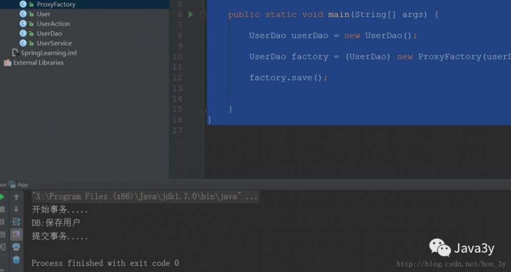 UserDao factory = (UserDao) new ProxyFactory(userDao).getProxyInstance();