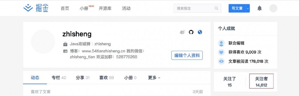 熟悉我的人都知道我写博客的时间比较早,而且坚持的时间也比较久,一直到现在也是一直保持着更新状态。最早最早开始写博客是在 CSDN 上写的,然后在简书也写过一段时间,后来放弃了简书转战了掘金,以下图片是自己在掘金这一年的成果,快 1.5 万 关注了,哈哈哈。