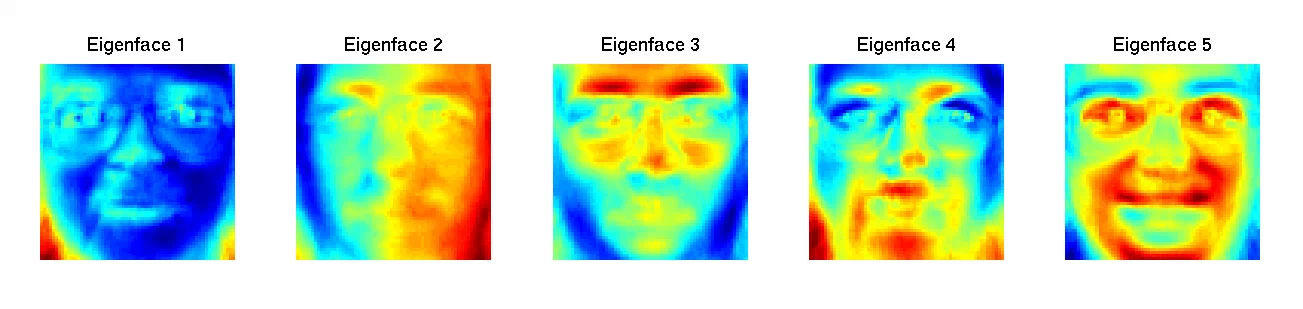 现在有 40 个人的人脸图片,每人 10 张,一共 400 张图片(ORL Database [3])。为简单起见,我们把这组图片降到5维,也就是只用 5 个特征来表示一张人脸图片。上面提到,如果只用5个特征,那每个特征本身就不能是一个像素点这么简单。那么这5个特征是什么呢?如下所示: