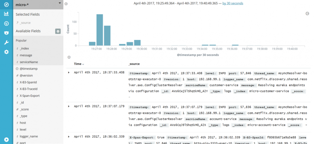 它会对客户帐户服务进行调用。所有的日志将会被存储在 Elasticsearch 并且以 micro-%{serviceName} 为索引 。日志可以在 Kibana 工具中被搜索,这项功能可以在 管理 -> 索引 中找到 模式 。让 Kibana 在 http://192.168.99.100:5601 中可用, 并在之后运行它,输入 micro-* , 我们会得到一个索引模式的 提示 。 在 发现 这个功能里,我们可以让我们输入的模式匹配日志,并做一个时间线的虚拟化。