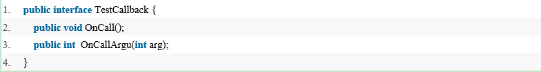 接口中我们声明了两个方法, OnCall 和 OnCallArgu ,写这两个函数主要用于示范不同类型函数如何在 JNI 层定义使用。 JAVA 层的回调接口写好后,我们将这个回调对象当作一个参数设置到需要的地址,比如一个 init 函数:
