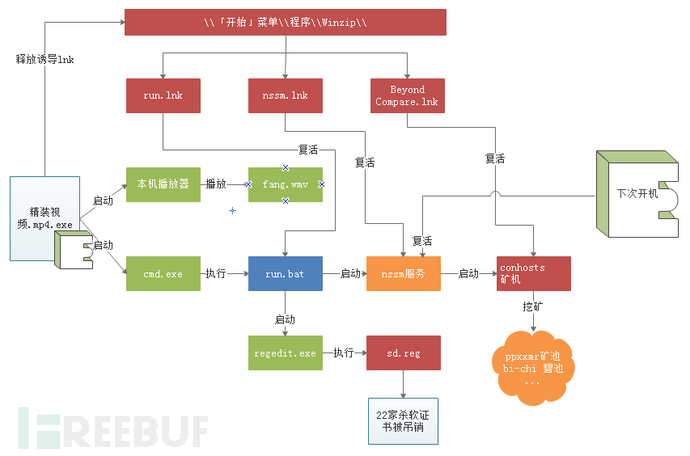 该挖矿木马设计精巧,伪装及复活能力强,目前已知功能:多渠道传播、多入口复活,同类排斥、远控、挖矿、破坏杀毒软件。