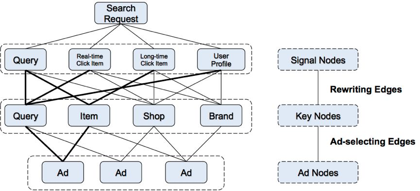 图 1. 基于用户行为异构图的个性化意图匹配。异构图中包含了三种节点:用户个性化的搜索意图信号、丰富的广告检索键和广告。