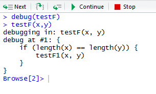 > debug(testF) > testF(x,y)