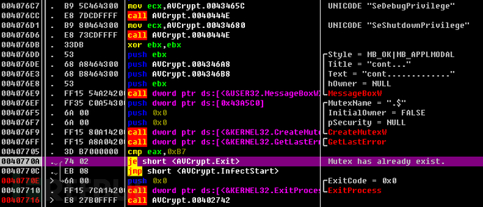 调整当前进程权限令牌至SeShutdownPrivilege权限等级,弹窗显示“cont………”(猜测用于测试版本使用),创建名“.$”的互斥体防止病毒程序重复启动。