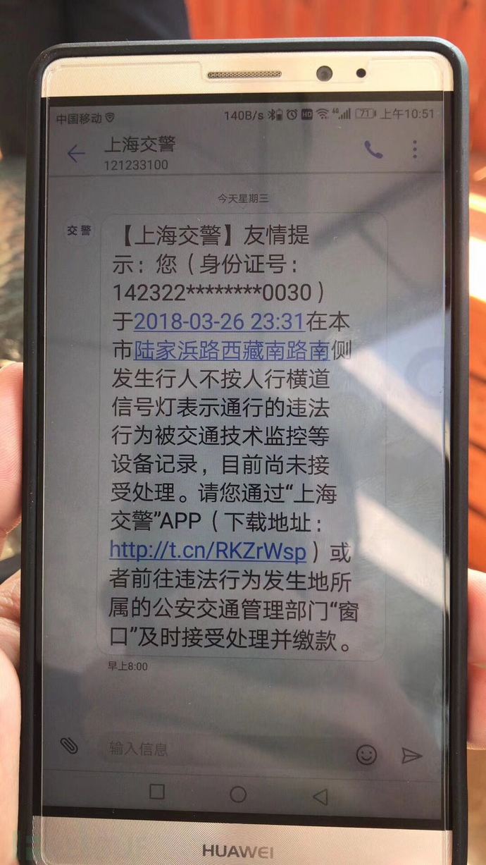 说话间,他指了指面前的红灯,还有一位正在闯红灯的大妈。随后跟我说,最近上海越来越多不守规则闯红灯的行人都收到了上海交警的短信提醒,提示号主某年某日在某条街道不按人行横道信号灯标识通行,行为违法且被交通技术监控等设备记录,要求号主尽快接受处理。