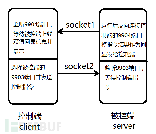 远控与后门的功能类似,其实现在来说远控木马和后门的区别已经不大了,在早年间,后门一般都是偏重隐藏,而木马一般偏重功能全面。现在基本上木马后门的界限已经很模糊了。本节要实现的是一个反弹性的远控,分为被控端(server)和控制端(client)两部分。控制端程序client监听本地端口,被控端server向控制端client发起连接,控制端client接受连接后记录被控端ip地址,并选择要控制的ip发送控制指令。出于原理演示,我们就用最简单的两个socket来实现网络连接和控制,被控端和控制端互相作为连接的发起方和接收方。说起来很绕,下面看图就很清晰了: