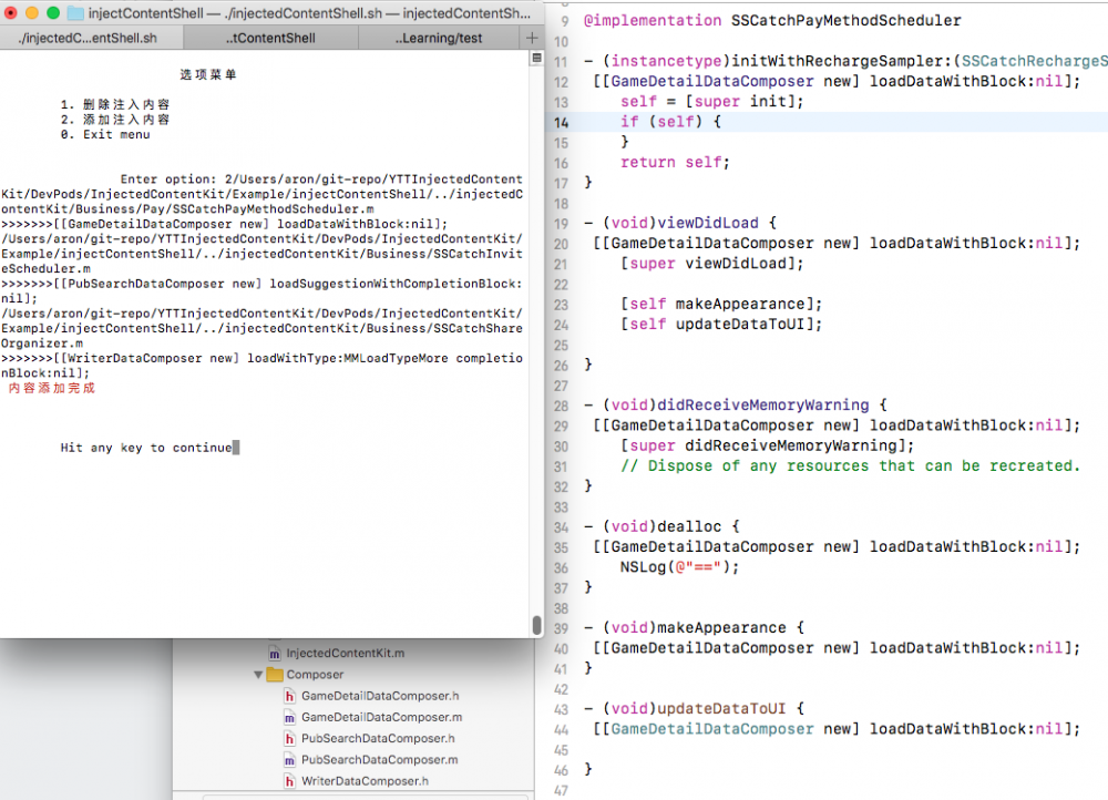 公司需要做一系列的壳版本,壳版本如果内容雷同提交到App Store会有被拒绝的风险,其中有一种解决方案是在壳版本中注入混淆的代码,防止被苹果检测到内容太过雷同而导致审核被拒绝,本文是针对这个场景,使用shell脚本进行半自动批量添加和删除混淆代码。