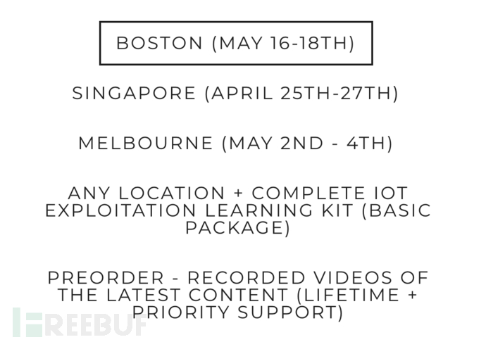 这里我先做个预告。在不久后,我们将举办IoT开发的公开课,其中涉及BLE嗅探,开发,Zigbee等主题,大家可以随时通过 secure@attify.com 与我们联系,或查看 这里 。公开课程的安排在这里: https://www.attify-store.com/collections/real-world-training/products/offensive-iot-exploitation-live-training 。