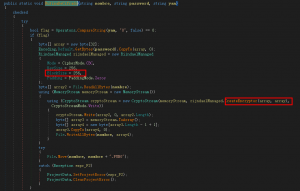 Timer在Form初始化事件中设定为每1秒钟触发一次,首先Timer会检测进程中是否如存在TslGame,如果存在则将Playtime(玩游戏的时间)加一,当playtime等于3时,则将timer停止,并初始化一个包含被加密文件后缀(.pubg)的数组对Desktop文件夹下的文件进行筛选。并使用GBUPRansomware作为密码对文件进行解密。