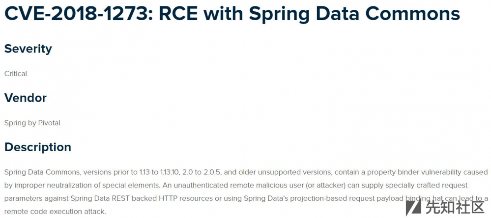 从漏洞公告页的Refference给出的两个链接 commit/b1a20ae1e82a63f99b3afc6f2aaedb3bf4dc432a 和 commit/ae1dd2741ce06d44a0966ecbd6f47beabde2b653 ,可以看出该漏洞为SpEL注入。