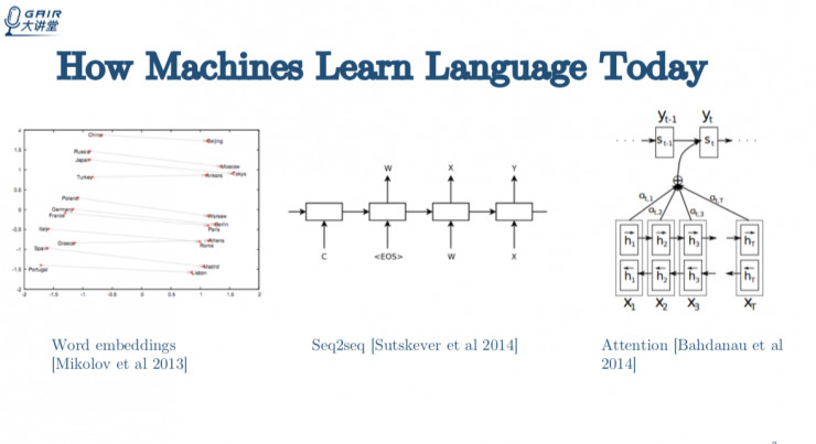 先来回顾一下近些年 NLP 发展的状况。NLP 发展的黄金时期出现在 2013 年末和 2014 年这段时间。这段时间出现三个非常重要的技术:Word embeddings;Seq2seq;Attention,这三项技术基本奠定了 2014 年之后的 NLP 发展基础。