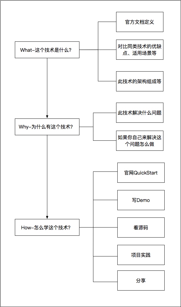 上面主要讲述了宏观层面的如何学习技术,而具体到学习某一个新技术,其实也是有法可循的。如下图所示: