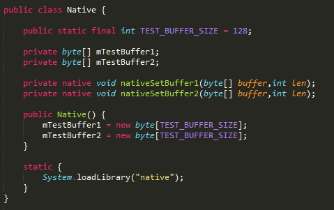 示例代码的主要文件有两个,一个是Native.java,是Java层的类;另一个是Native.c,是JNI层的文件,关键的地方我都用注释添加到代码中了,完整的代码见博文后面的附件。