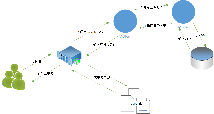定义处理用户请求的Action类;这一步是非常重要的,这里定义的Action类就是MVC中的“C”,就是所谓的控制器,该控制器负责调用Model里的方法来处理请求,对于一些非常简单的请求可以在Action中直接处理。