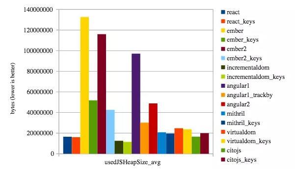 如果你正在使用 React,Ember,Angular 或者其他 DOM 操作库,使用 array-ids(或者 Angular 1.x 中的 track-by 特性)非常有助于实现高性能,对于动态网页尤其如此。我们已经在上一篇程序衡量标准的文章中看到这个特性的效果了: More Benchmarks: Virtual DOM vs Angular 1 & 2 vs Mithril.js vs cito.js vs The Rest (Updated and Improved!)。