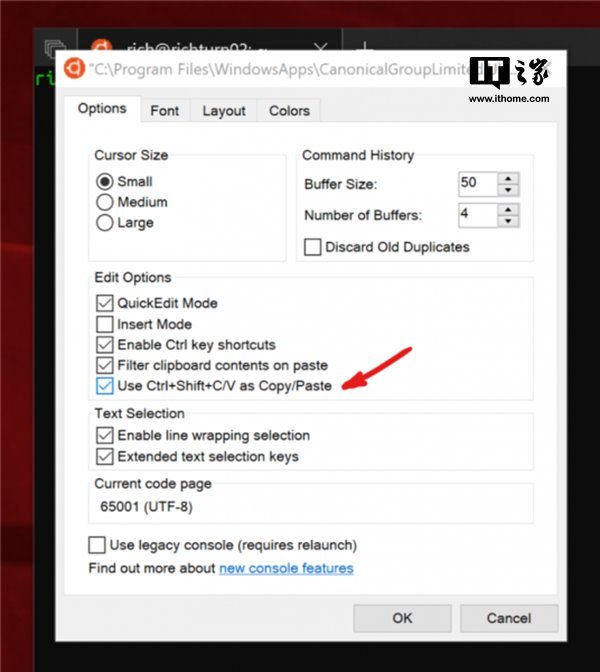 要试用此功能,在控制台的“选项”属性页面中启用“使用Ctrl + Shift + C / V作为复制/粘贴”选项(查看下面的图像以供参考)。微软还提到,可以为每个Shell或快捷方式独立设置此项。