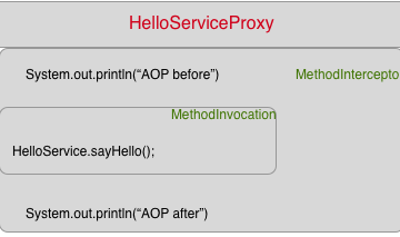 MethodInvocation 是对 HelloService.sayHello(); 的封装,而 MethodInterceptor 持有了 MethodInvocation ,在调用其之前进行了增强处理,这就是AOP的实质.