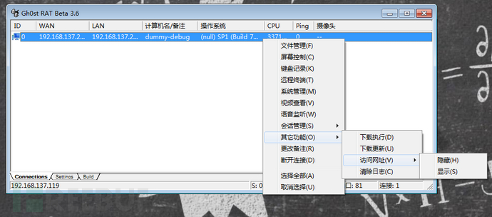 大灰狼是在Gh0st公开的源码基础上改进出的一个木马家族,对Gh0st的很多功能细节都进行了较大幅度的修改,再加上大灰狼也开放了自己的源代码导致大灰狼也演化成了包含各种变种的一个独立家族,因为大灰狼的主要影响范围在国内,而且其通讯协议在Gh0st基础上做了更多加密隐藏的工作,所以已有的针对大灰狼的技术分析文献相对较少,其变种的特征也不是很明显。大灰狼与Gh0st有非常相似的控制端界面: