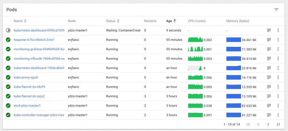 $ kubectl get pods --all-namespaces NAMESPACE NAME READY STATUS RESTARTS AGE kube-system etcd-ydzs-master1 1/1 Running 0 10m kube-system kube-apiserver-ydzs-master1 1/1 Running 0 10m kube-system kube-controller-manager-ydzs-master1 1/1 Running 0 10m kube-system kube-dns-86f4d74b45-f5595 3/3 Running 0 10m kube-system kube-flannel-ds-qxjs2 1/1 Running 0 1m kube-system kube-proxy-vf5fg 1/1 Running 0 10m kube-system kube-scheduler-ydzs-master1 1/1 Running 0 10m