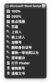 对于我们常书写的文书中,有大量制式但又存在个案差异的情况,需要大量的复制粘贴,又要对部分文字进行修改,在我们刚开始使用的智审系统里,它会将这些固定的信息填写好,目的是减少我们书写的工作量,但实际操作中会存在非常多的错误,会大大加大校对的难度和出错率,所以求人不如求己,直接促使我使用 Keyboard Maestro 来强化本部分的操作了 :grin:。