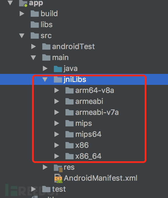 首先创建一个安卓工程,在src/main下创建目录jniLibs,然后将apk lib下的so文件复制进来(保留目录结构),项目结构下图所示