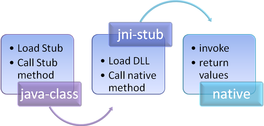 Jni对于应用本身来说,可以看做一个代理模式。对于开发者来说,需要使用c/c++来实现一个代理程序(jni程序)来实际操作目标原生函数,java程序中则是jvm通过加载并调用此jni程序来间接地调用目标原生函数。