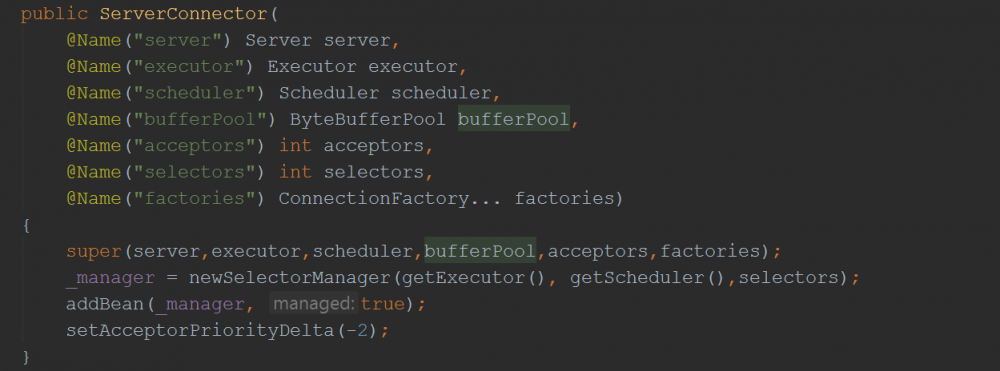 我们先来回顾一下 Jetty 负责网络连接的类 ServerConnector 的构造函数: Jetty源码剖析系列(7) - 底层网络通信的细节 可以看到在ServerConnector的构造函数里会创建一个 SelectorManager ,然后加到它的bean里面(这里其实体现了Jetty的一个设计模式,就是设计了一个containner,把相关的模块放到这个containner里面,启动该container(调用doStart方法)就会连带启动里面的模块(调用模块的doStart方法), Jetty里面的Server,Connector都是这样的containner。)