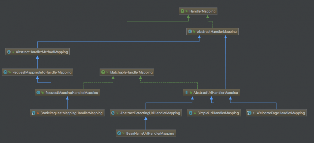 HandlerMapping 分为两种类型,一种是url到方法 AbstractHandlerMethodMapping ,这种形式比较常用,也是业务开发中主要使用到的形式,一种是url到其他处理器比如Controller,Resource的 AbstractUrlHandlerMapping ,该类属于Spring3之前常用的类. 下面按照模板方法设计模式的思路来分析