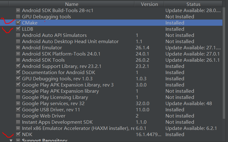 1、在SDK Tools 中勾选安装 CMake、LLDB、NDK