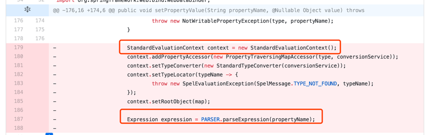 简单分析一下漏洞补丁,通过下面标注的地方,可以发现这是一段SpEl表达式解析。所以猜测可能是SpEl表达式注入导致的远程代码执行