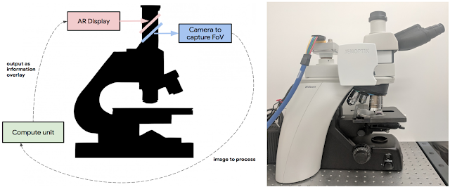 | Left: Schematic overview of the ARM. A digital camera captures the same field of view (FoV) as the user and passes the image to an attached compute unit capable of running real-time inference of a machine learning model. The results are fed back into a custom AR display which is inline with the ocular lens and projects the model output on the same plane as the slide. Right: A picture of our prototype which has been retrofitted into a typical clinical-grade light microscope. |