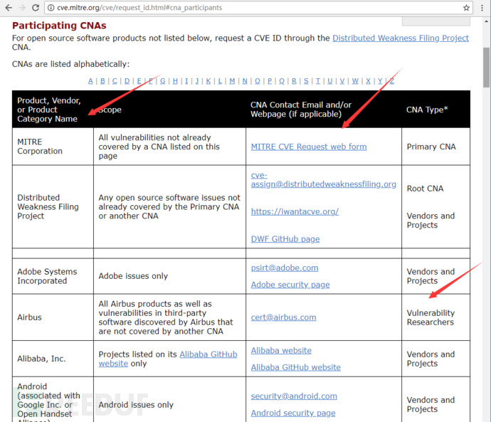 首先来说说这第一种找Participating CNA要CVE编号,Participating CNA的意思就是参与CNA,你可以把他们理解为参与CVE计划的公司或项目发起者,总之就是有产品拿出来让大家挖漏洞的,这些CNA有一个列表在 http://cve.mitre.org/cve/request_id.html#cna_participants