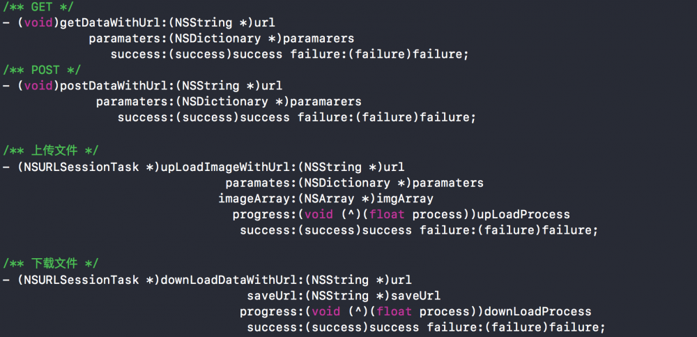 2.常用的网络请求类型。这是对外的API,外部通过调用这些接口实现相关的网络请求。当然你也可以根据自己的需要暴露相关的API。相应的接口实现比较简单。具体的逻辑还应根据业务需求在外部实现。对于文件的操作,如图片的上传,可参考代码如下。