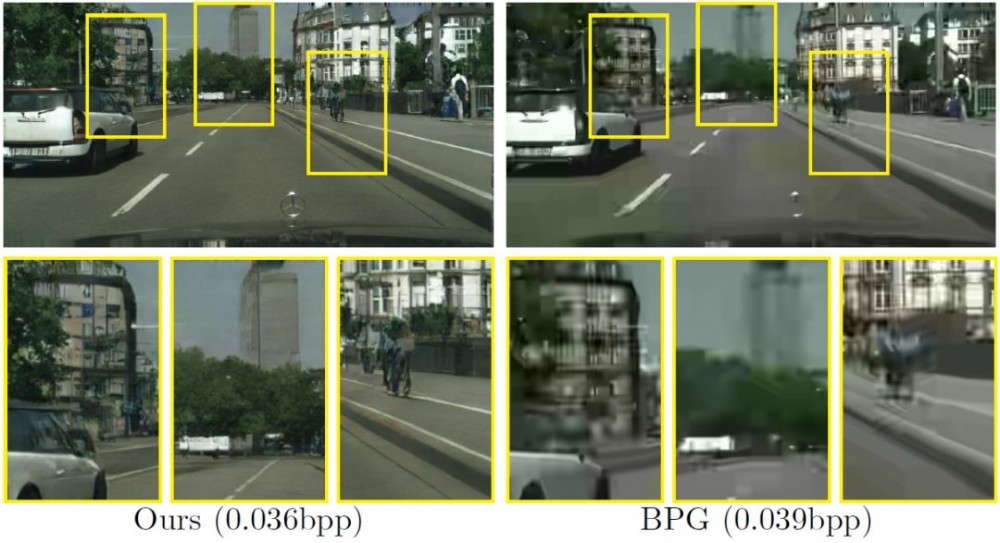图 1:以对抗损失训练得到的全局生成压缩网络产生的图像,以及相应的 BPG 结果对比 [1]。