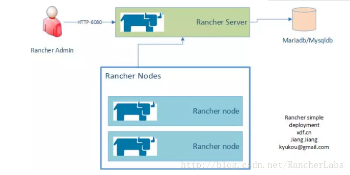 一个server,一些节点 ,一个mysql数据库。从这张图上就可以发现Rancher在部署上的一些问题: