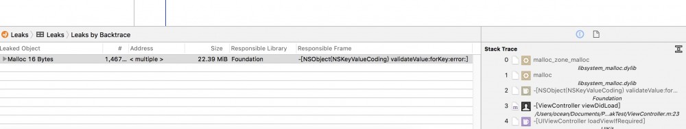 可以看出,泄漏发生在validateValue:forKey:error:,再细看右边的调用栈,可以看到这块内存是由malloc分配的。所以很有可能是这个系统方法内部发生了泄漏。