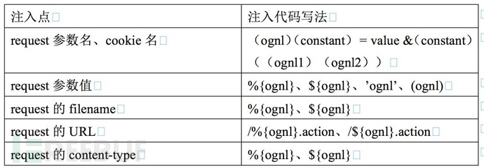 虽然上述漏洞那么多,但是其本质都是一样的(除了S2-052以外),都是Struts2框架执行了恶意用户传进来的OGNL表达式,造成远程代码执行。可以造成“命令执行、服务器文件操作、打印回显、获取系统属性、危险代码执行”等,只不过需要精心构造不同的OGNL代码而已。那么,漏洞都是如何触发,或者说,如何注入OGNL表达式,造成RCE,下面用一个表来简要概括: