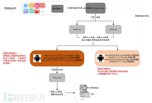 “寄生推”通过SDK预留的“后门”,云端动态更新下发恶意代码包,Root用户手机,植入恶意应用到用户设备系统目录,进行恶意广告行为和应用推广,以实现牟取灰色收益。
