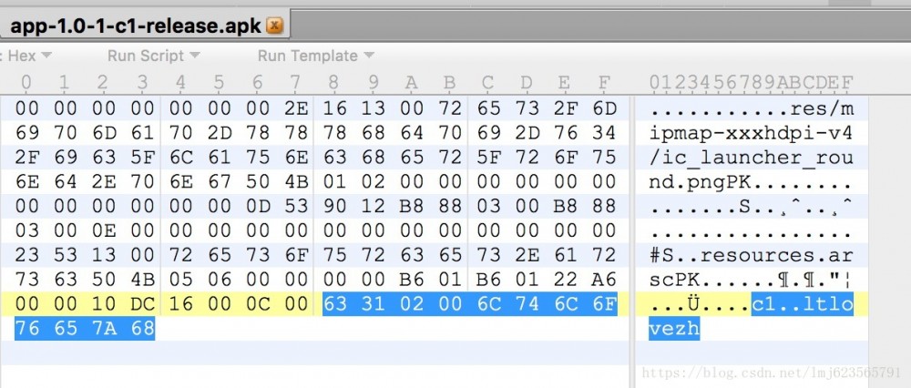 在看源码之前,我们也可以使用二进制编辑器打开打包好的Apk,看末尾的几个字节,如图: