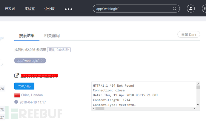 在网络上寻找weblogic服务组件的网络设备,方法有很多,笔者使用的是钟馗之眼。使用命令:app:”weblogic”,查到有很多的这种设备。