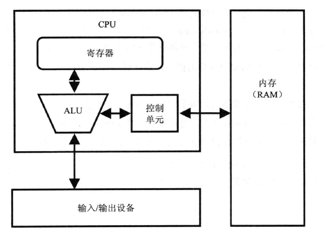 • 中央处理单元( CPU ),负责执行代码 • 内存(RAM),负责存储所有的数据和代码。 • 输入/输出系统(IO),为硬盘、键盘、显示器等设备提供接口。