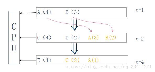 若不能执行完,则放到下一个队列尾部(橙色部分)