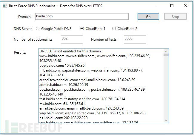我用C#写了一个非常简易的子域名爆破工具,为了演示DNS over HTTPS。( 仅为技术讨论使用,请勿用于违法用途! )使用的是JSON格式的DNS over HTTPS,可以从UI上选服务器。纯字典搜索,字典是从 dnsrecon项目 复制过来的。